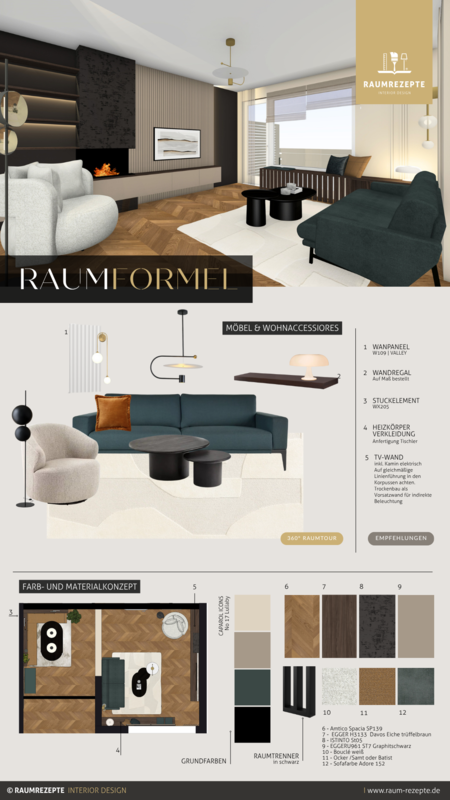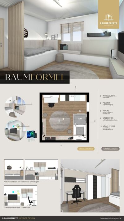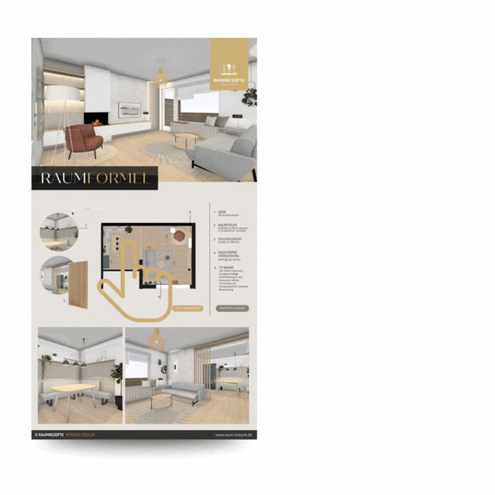 Die RAUMFORMEL ist deine Einrichtungsplanung inkl. kompakter 3D-Raumvorlage, die dir zeigt, wie du deinen Raum optimal nutzt und an welchen Stellen du Möbel, Stauraum und Design-Akzente platzierst. So startest du inspiriert und mit einer klaren Raumvorstellung in dein nächstes Einrichtungsprojekt – ganz ohne Verzetteln oder böse Überraschungen