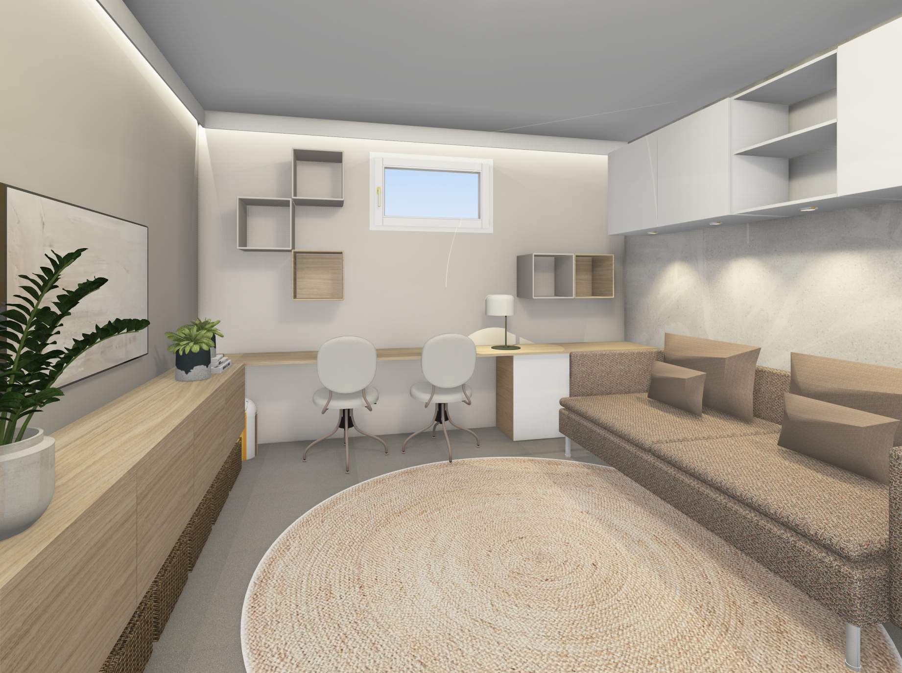 Um all ihre Wünsche umzusetzen, habe ich mit der RAUMFORMEL einen detaillierten Raumplan erstellt, der jeden Millimeter des Raums optimal nutzt. Mithilfe des virtuellen Rundgangs konnten die beiden sich genau vorstellen, wie das spätere Ergebnis aussehen wird. So gelang es, alle Bereiche harmonisch zu verbinden und einen durchdachten, gemütlichen Rückzugsort zu schaffen.
