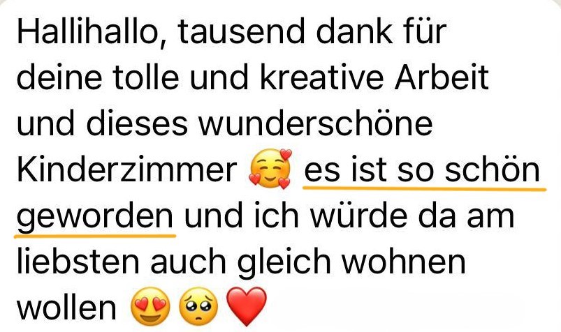 - Nun entwickeln wir dein ganz persönliches Farbkonzept, wählen passende Materialien aus und gestalten deine Wände – und wer weiß, vielleicht auch die Decke – damit ein Raum entsteht, der gemütlich ist und gleichzeitig etwas ganz Besonderes.